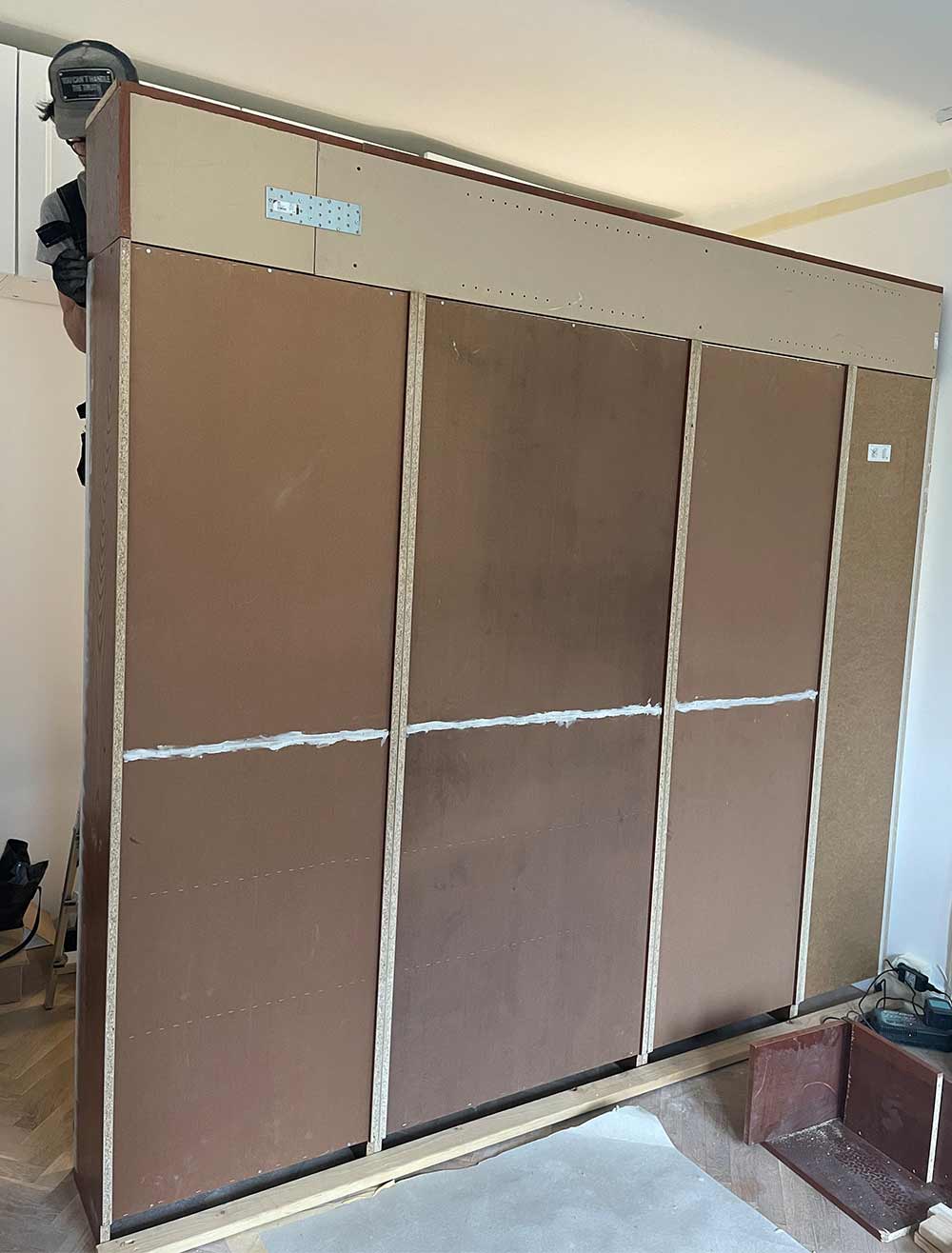 4. Efter det reglade de upp väggen bakom bokhyllorna och klädde in hela garderoben i ek-panelerna och avslutningslister (se stegen i ett filmklipp i slutet av denna bildserie).