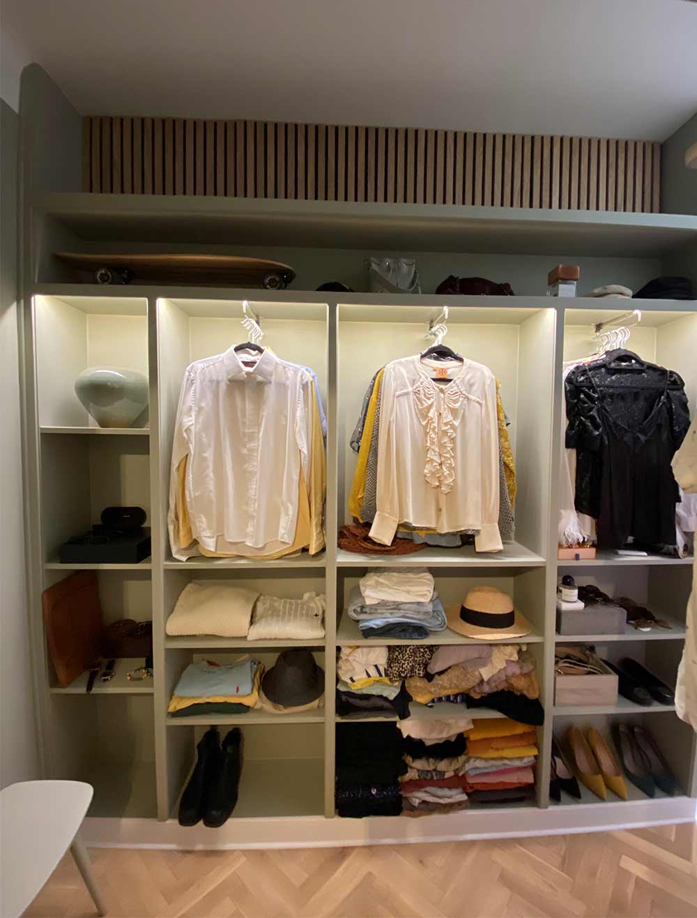 - Hyllplanen i bokhyllan togs bort för att skapa mer plats för upphängning av kläder.
