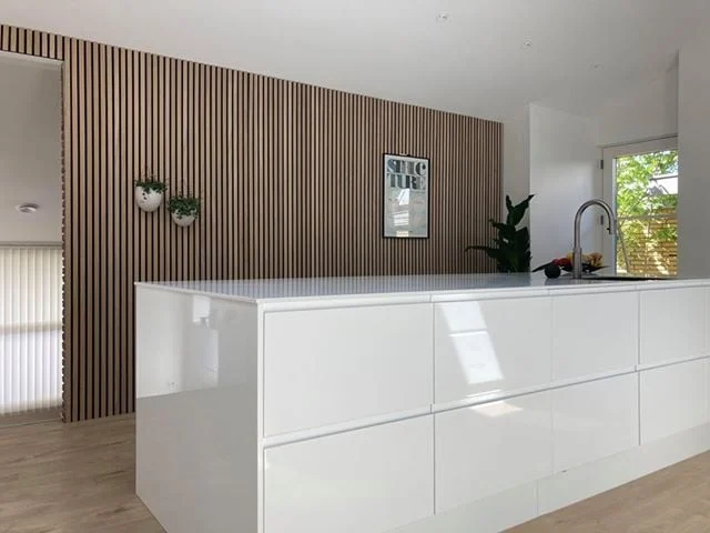 Hårda ytor i hallen kan skapa mycket eko. Här kan paneler både förbättra ljudet och ge ett stilrent första intryck direkt när man kliver in.