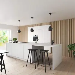 Vår akustikpanel i ek är uppbyggd av en ljudabsorberande polyesterfilt i botten och lameller av genomfärgad svart MDF klädda med exklusivt ekfanér på framsidan. Resultatet är en stilren panel med naturlig träkänsla och en svart kärna som ger en effektfull kontrast.