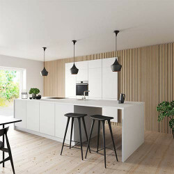 Vår akustikpanel i ek är uppbyggd av en ljudabsorberande polyesterfilt i botten och lameller av genomfärgad svart MDF klädda med exklusivt ekfanér på framsidan. Resultatet är en stilren panel med naturlig träkänsla och en svart kärna som ger en effektfull kontrast.