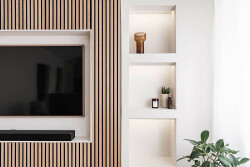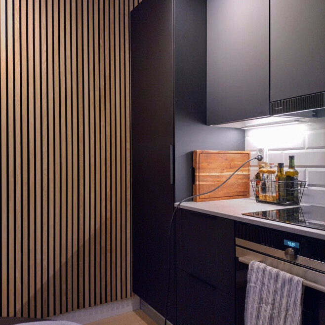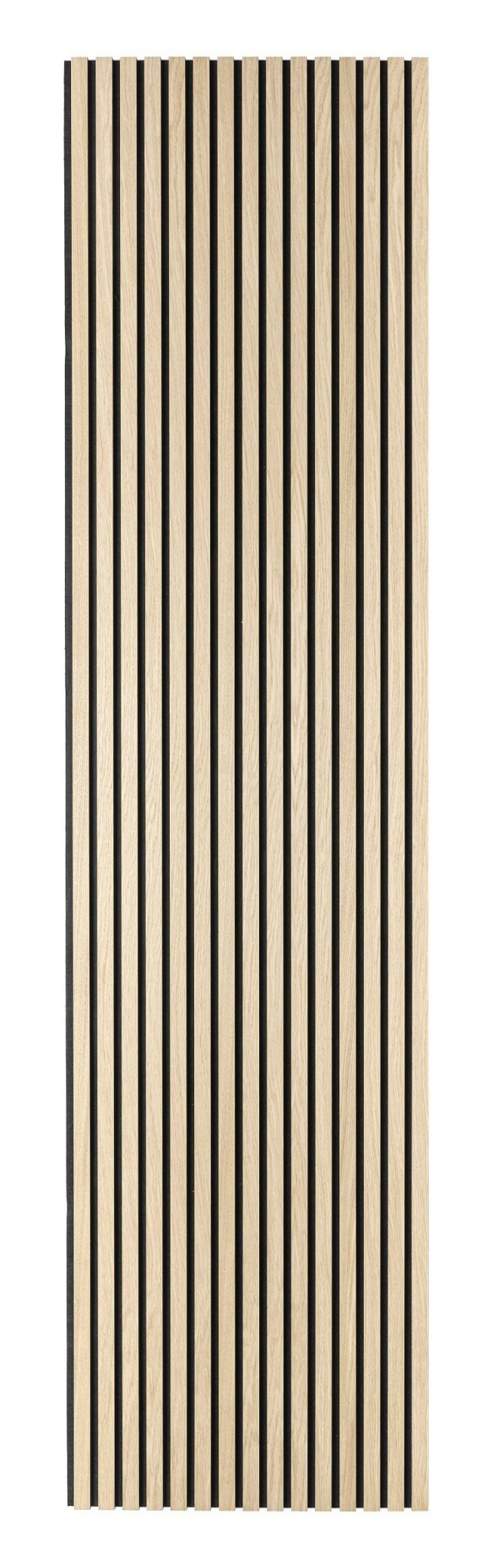 Ek är ett tidlöst träslag, som genom historien har används för allt från skeppsbygge till möbelsnickerier. Idag är eken kanske det vanligast förekommande träslagen i de flesta hem. Allt från golv, möbler och finsnickerier tillverkas i ek. Panelerna, med dess svarta filt smälter därmed sömlöst in i de allra flesta rum, samtidigt som ribbornas svarta MDF får ribborna att smälta samman med bakgrunden och ge ytan ett häftigt djup.
