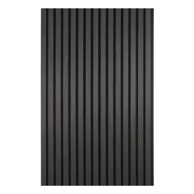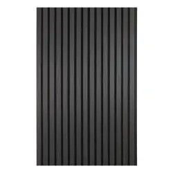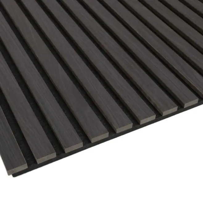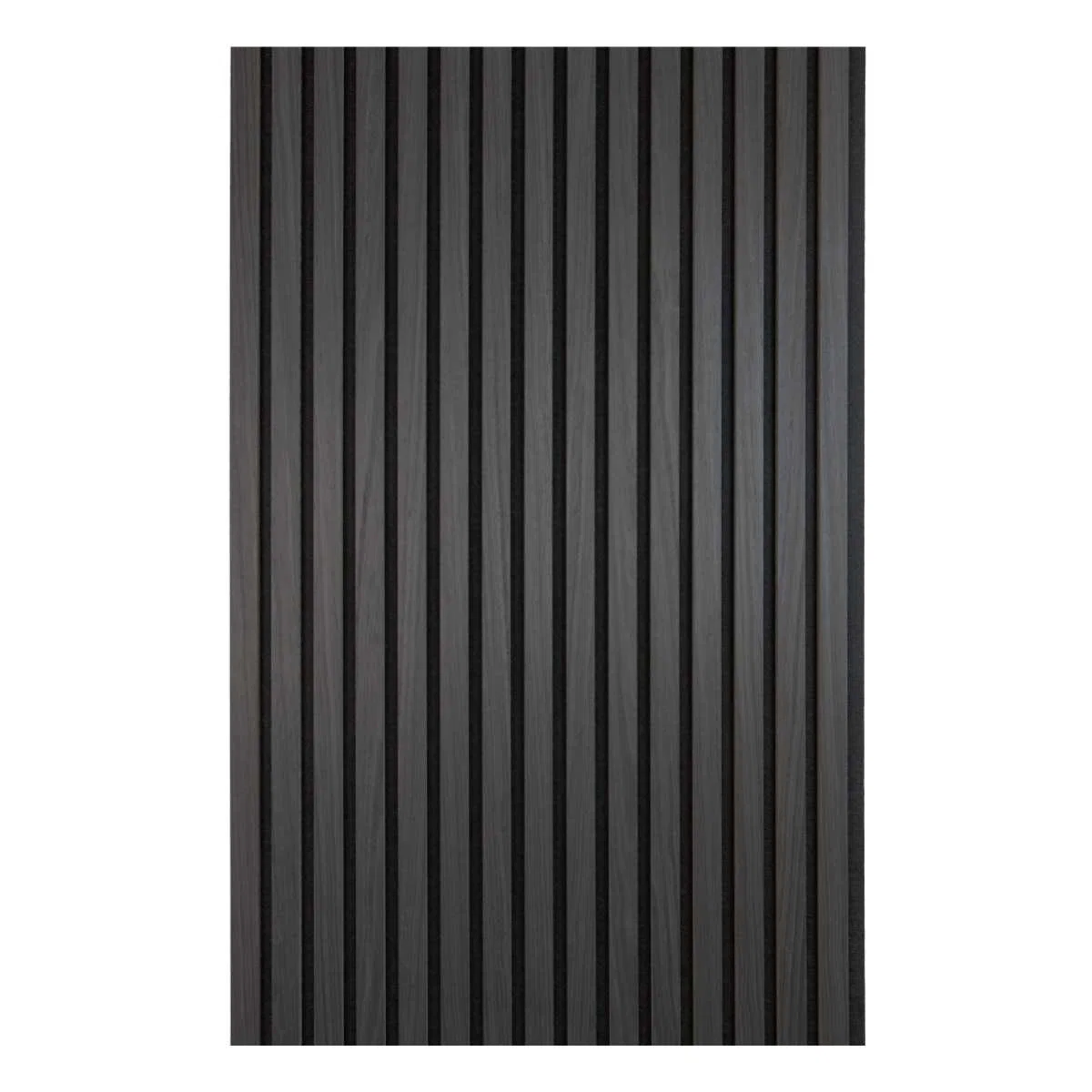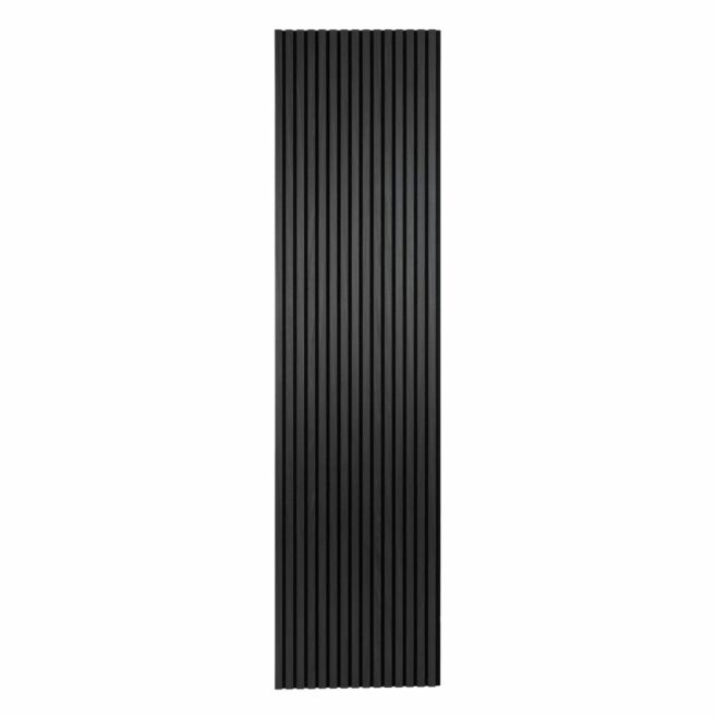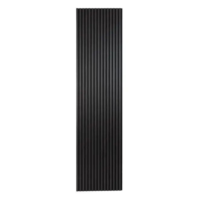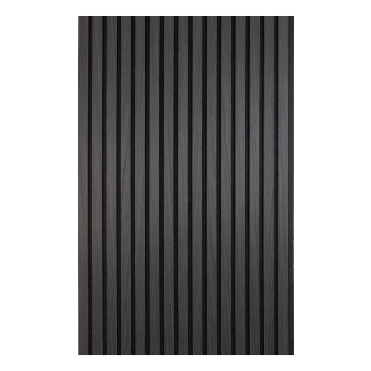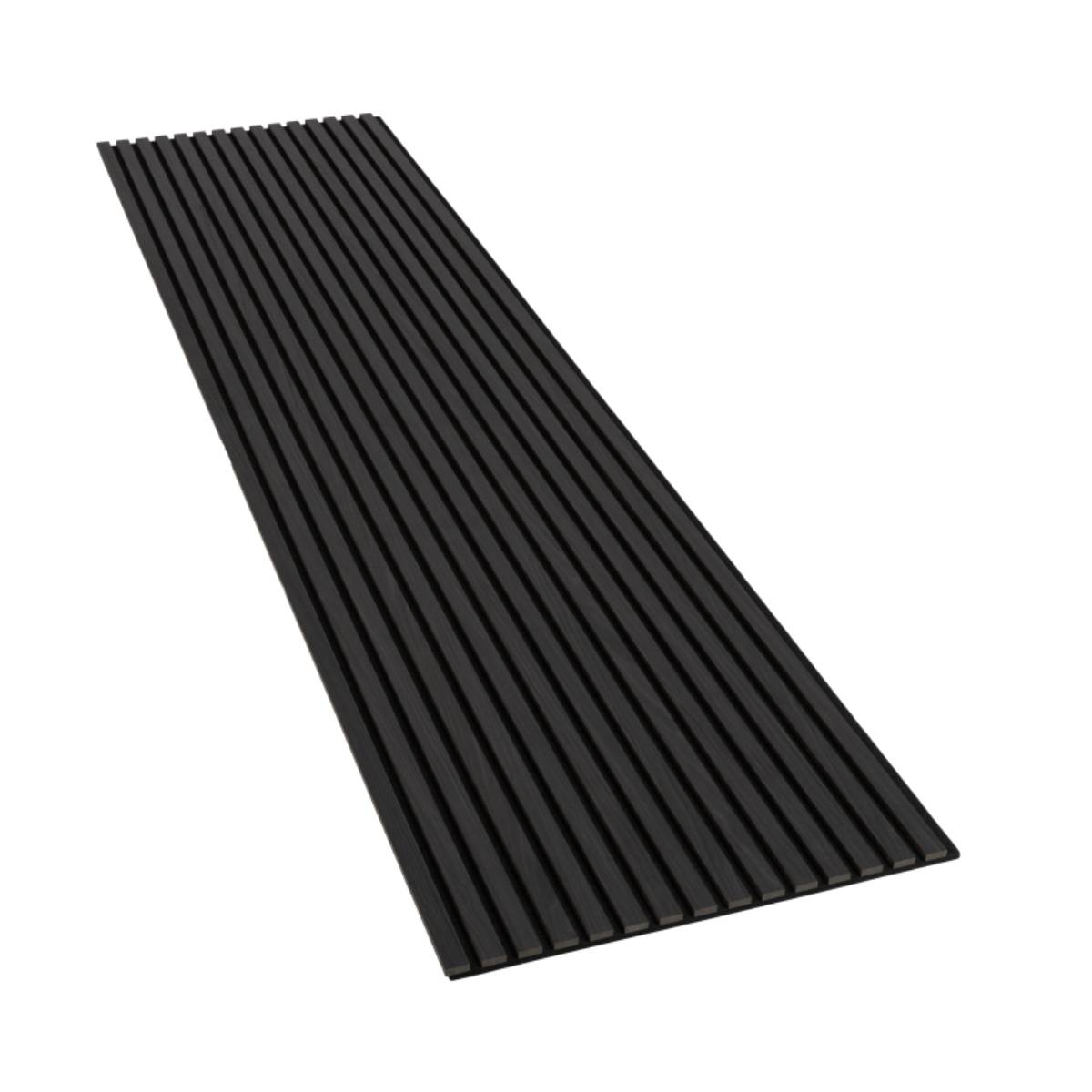 Panelen är tillverkad av en ljuddämpande akustikfilt i botten, kombinerad med lameller av genomfärgad svart MDF klädda med äkta ekfanér.