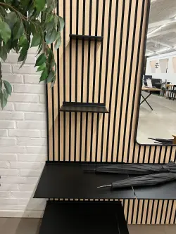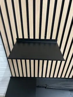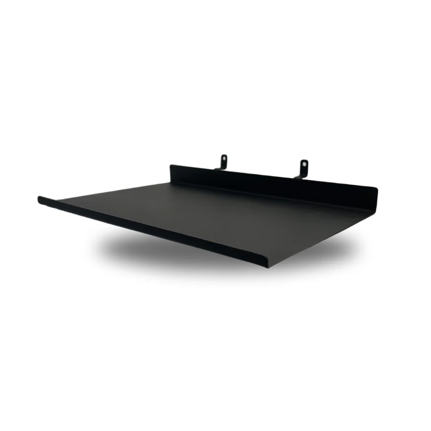 Praktisk och stilren skruvmonterad hylla i svart pulverlackerat stål, designad för att passa perfekt till akustikpaneler. Hyllan är ett enkelt sätt att kombinera funktion och modern inredning, samtidigt som den smälter snyggt in i panelväggen.