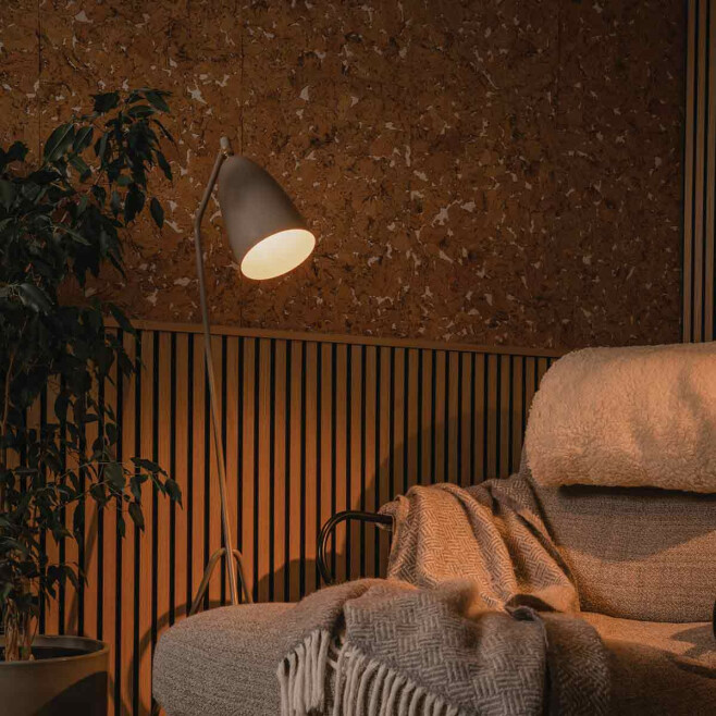 Kork tillverkas av korkekens bark och får naturligt en naturlig och oregelbunden struktur. Varje vägg blir med andra ord unik och de härligt mörka tonerna i träet ger liv och naturlig ro vart än det hamnar. I kombination med valnötsdetaljer, eller som komplement till en vägg klädd med valnötspanel kommer det absolut bästa ur bägge materialen fram.