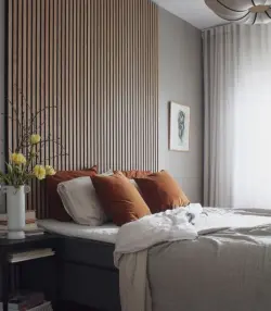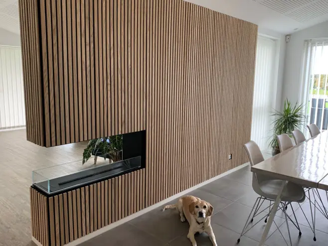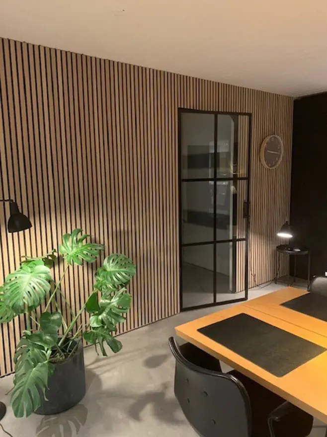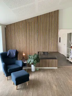 En ribbvägg ger en modern och snygg känsla i hela rummet. Väljer du att klä in en hel vägg eller bara en del av den så skapar det ändå ett otroligt lyft till rummet. Det visuella får inte bara ett lyft utan med en ribbvägg som också kallas för akustikpanel får du en bättre akustik. Många restauranger, hotell eller större offentliga miljöer använder akupanel för att dämpa ljudnivån och förbättra akustiken. Våra akupaneler eller ribbväggar har blivit professionellt ljudtestade EN/DS 354:2003 hos DELTA i Hørsholm, A part of Rice Technology. Testresultatet på ljudnivån kan skickas om man så önskar.