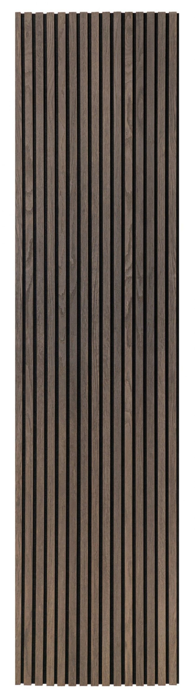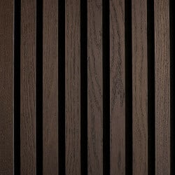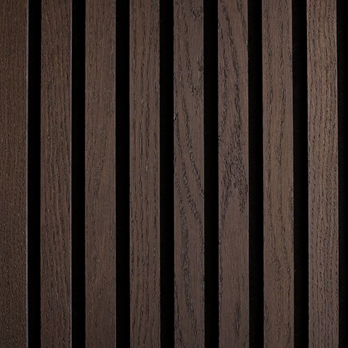 Ribbvägg av ek i toppkvalité, fabriksbehandlad i en härligt mörk nyans. Skapar en fantastik atmosfär och gör akustiken bättre. Ribbväggen är enkel att montera med lim eller skruv direkt på väggen. Ribbpanelen som också kallas akupanel är tillverkad i Danmark med FSC certifierat trä. Provpaket går att beställa!