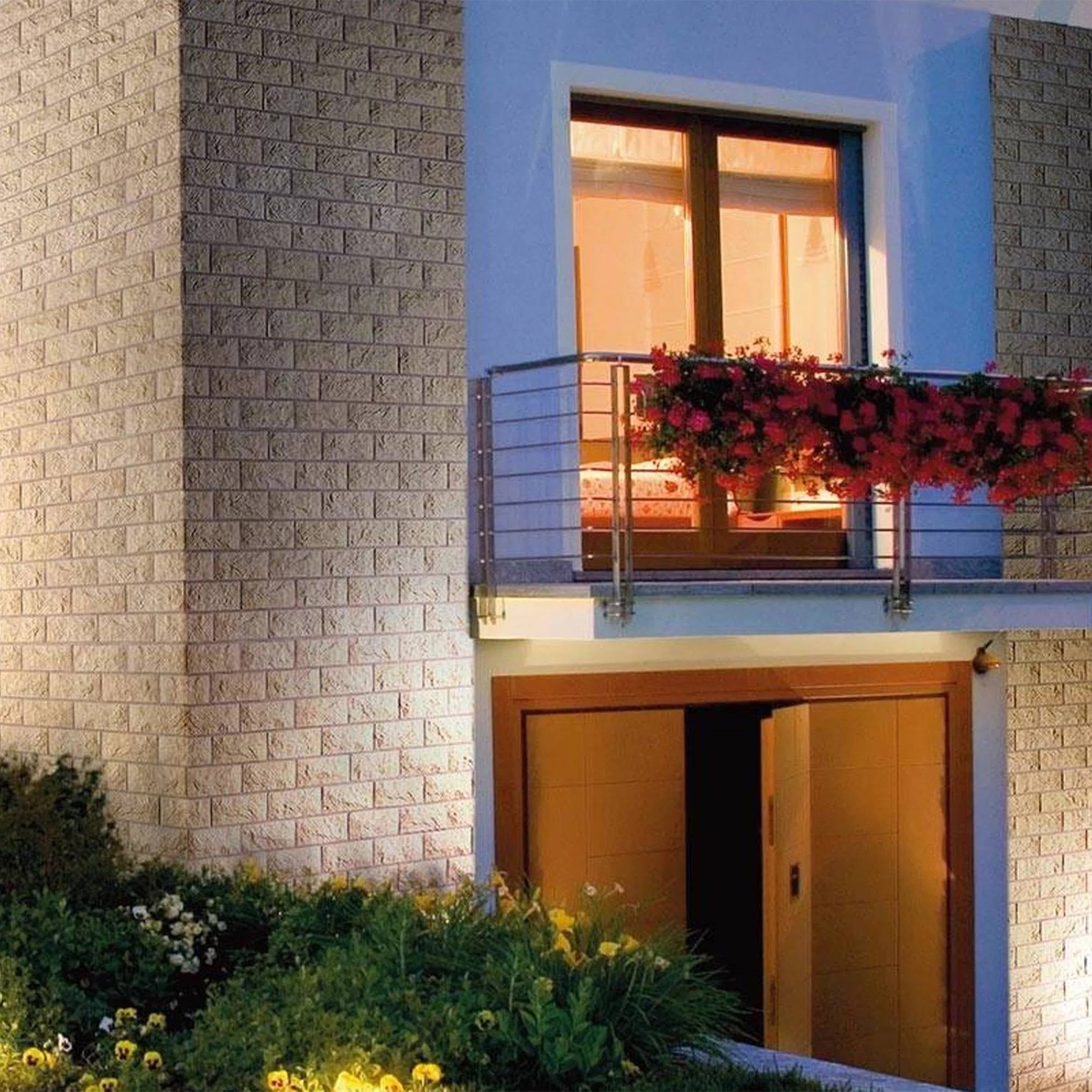 Stenväggen Building Flamme har en grovhuggen textur med mörkare färgaccenter som ger ett flammigt uttryck. Stenen passar utmärkt till fasader eller trädgårdsväggar som man vill ge en robust känsla, men går även att använda som accentvägg inomhus. Den mejslade ytan kan med fördel framhävas med hjälp av punktbelysning. Stenarnas rektangulära form gör dem enkla att formpassa in på de allra flesta ytor.