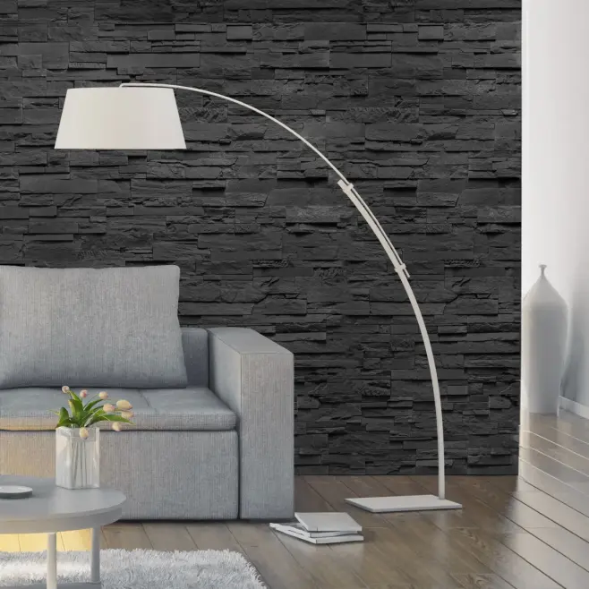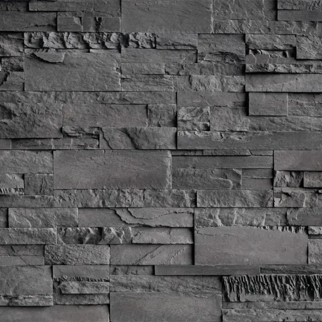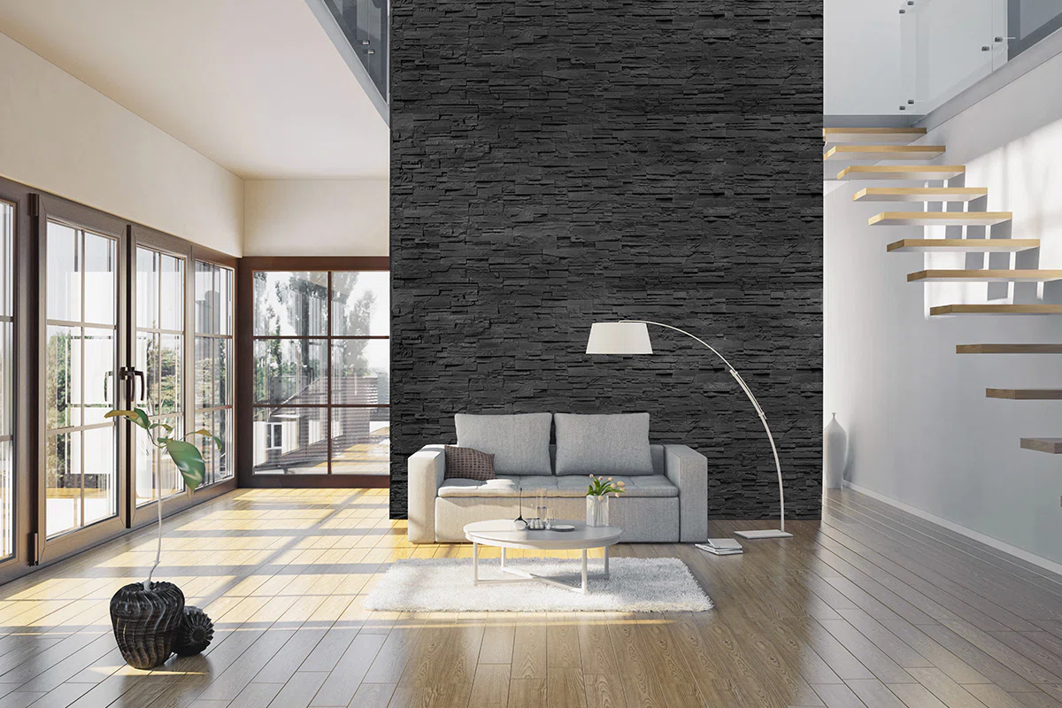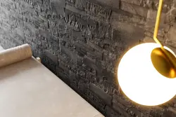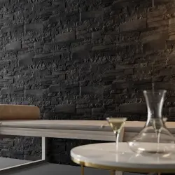 Stenväggen Neo är formgiven med raka linjer och en grovhuggen yta, här i en mörkgrå ton för ett massivt sten-intryck. Stenen blir snabbt ett blickfång oavsett i vilket rum den hamnar, och de naturligt oregelbundna linjerna ger en känsla av harmoni. Med punktbelysning riktad mot stenen förstärks intrycket ytterligare, både inomhus och utomhus. Stenen installeras enkelt med kakelfix och ingen fog behövs mellan stenarna.
