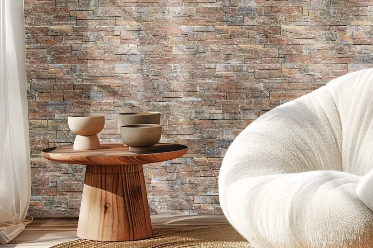 Stenväggen Rugged Ledgestone stonewall.se är en flexibel stenimitation som passar in i princip överallt, här i varma sandfärgade toner. På ett enkelt sätt skapas en lyxig känsla med naturliga inslag, t.ex. som en fondvägg, för att förstärka en naturlig utsikt eller för att skapa en levande känsla runt kaminen. Stenen går att placera överallt i huset och ger ett levande intryck som sticker ut bland de andra husen på gatan. Stenen installeras enkelt utan att någon fog behövs mellan stenarna, och fungerar lika fint utomhus som inomhus.