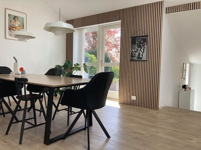 Akustikfilten bakom ribborna är 9 mm tjock på våra Premium väggar. Våra ribbväggar från Akutrade har en akustikfilt på 8 mm.
