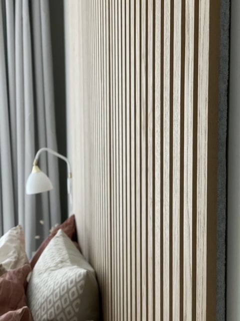 Nedan ser ni en bild på en sänggavel med akustikpanel Premium Ek smoked hemma hos Annika Benedel.