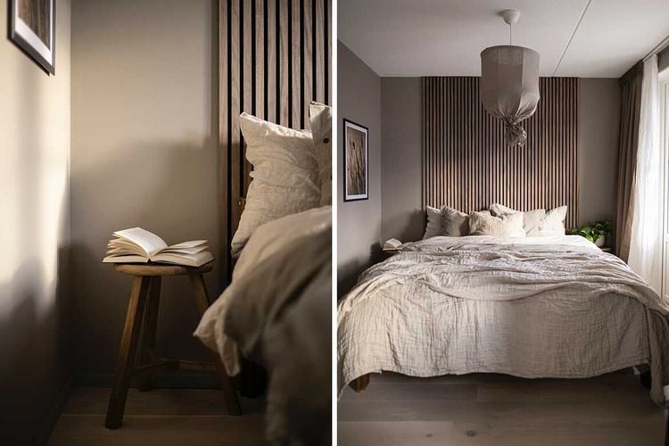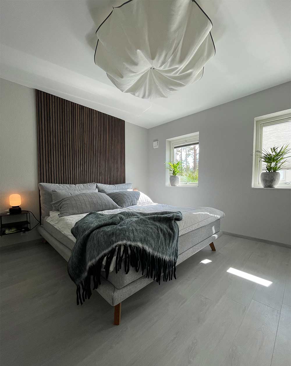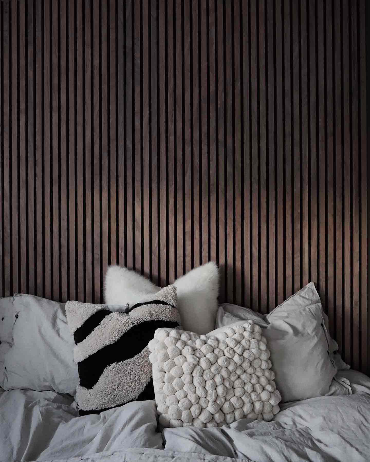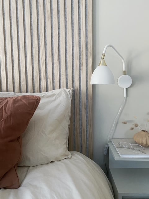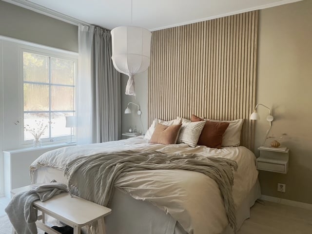 Här är akustikpanel Premium Valnöt som sänggavel hemma hos Andrea Norrman.