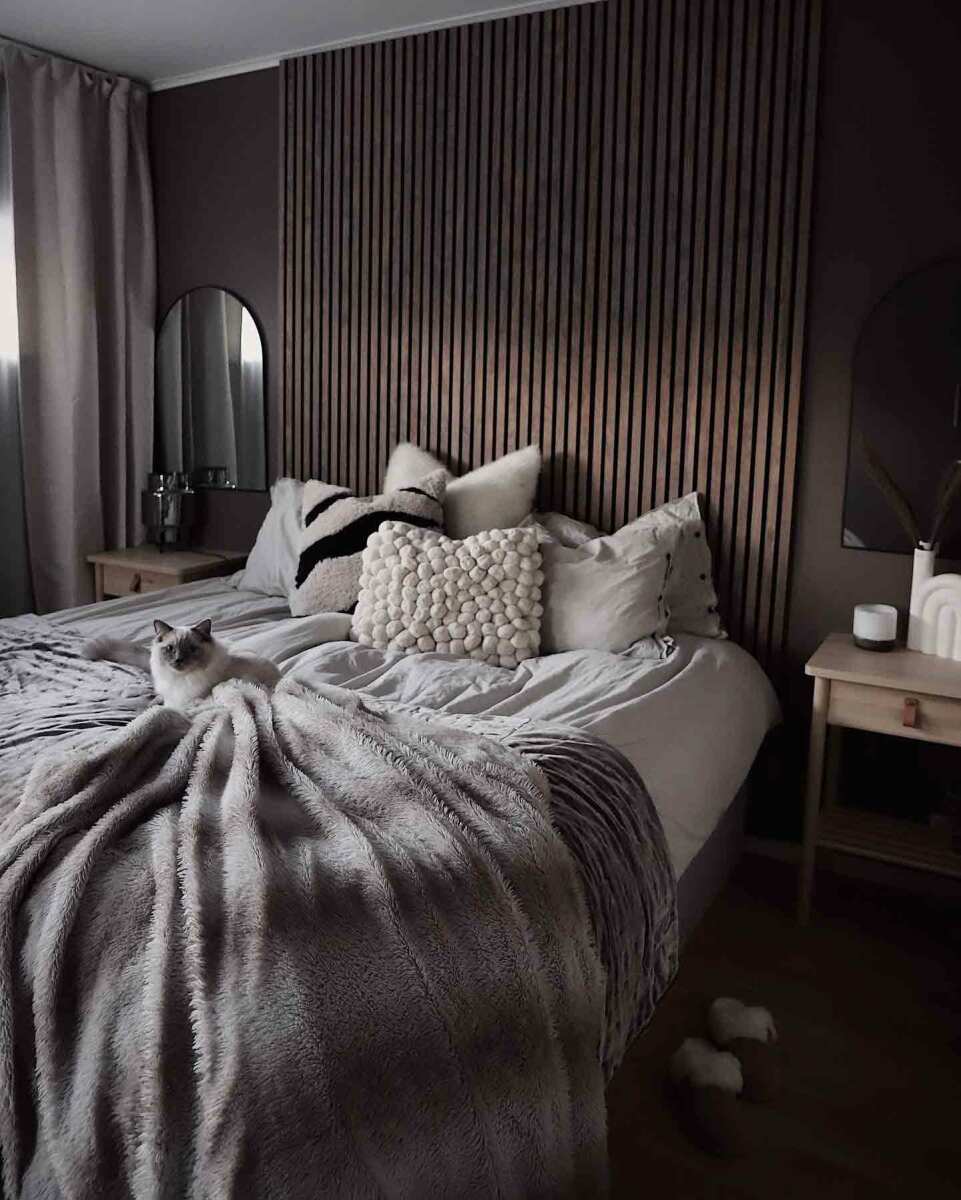 Här är akustikpanel Premium Valnöt som sänggavel hemma hos Andrea Norrman.